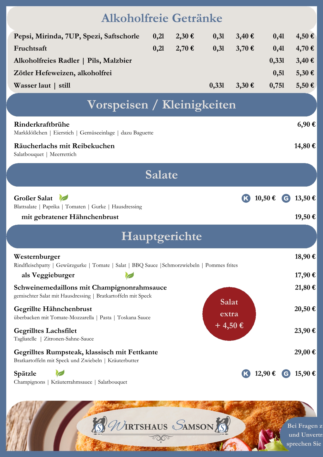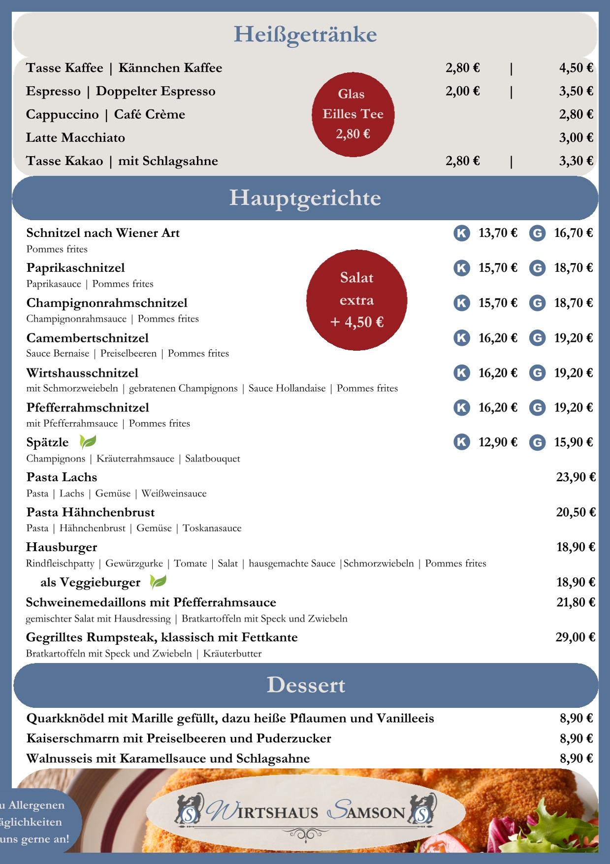 Vorspeisen und Nachspeisen können nach Absprache gerne vereinbart werden. Auch Sonderwünsche sind in aller Regel nach vorheriger Absprache problemlos möglich.