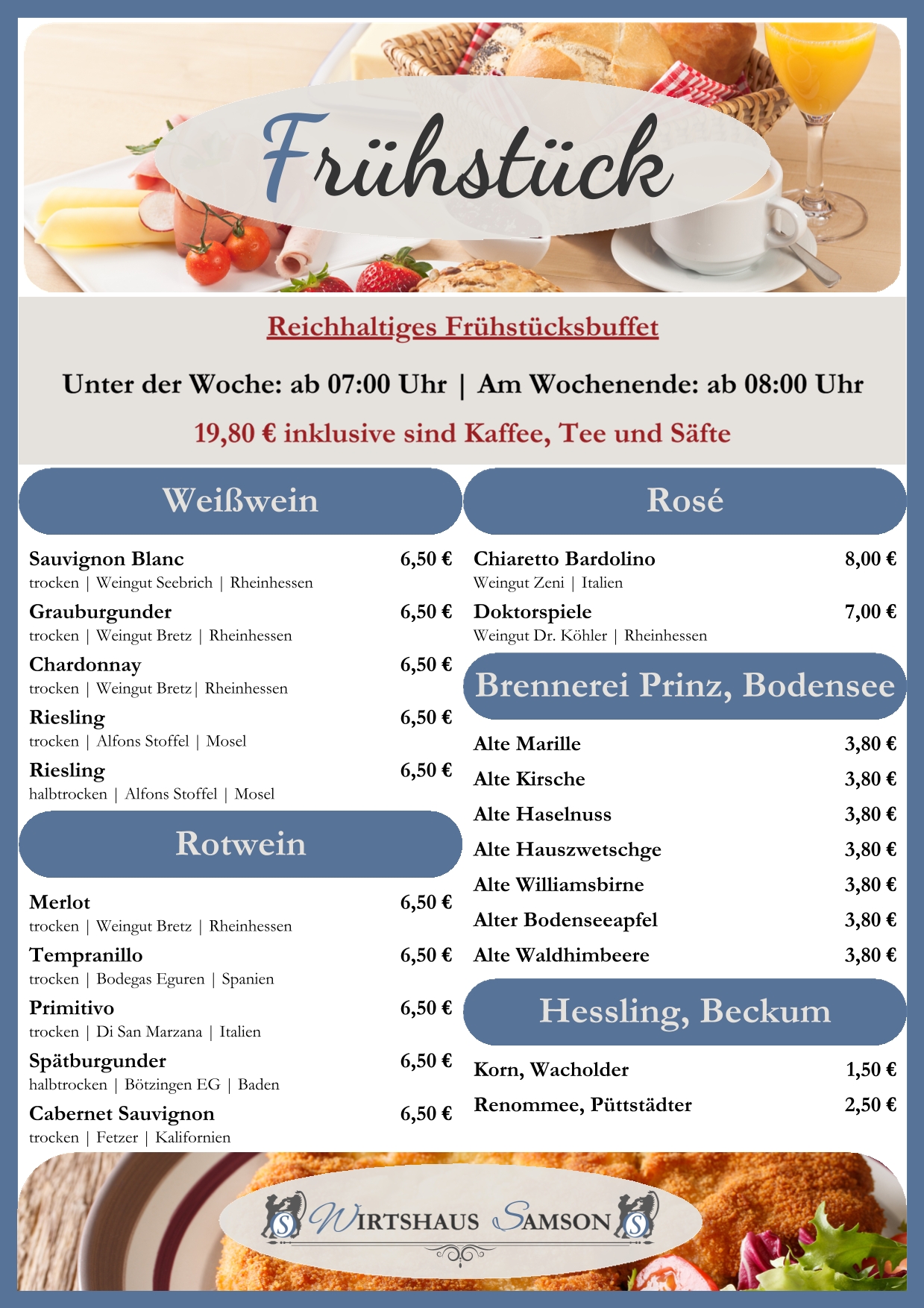 In unserem Wirtshaus können Sie täglich in gemütlicher Atmosphäre frühstücken. Unser Frühstück vom Buffet bietet eine reichhaltige Auswahl mit vielen Produkten direkt aus Beckum. Unter der Woche ab 07:00 Uhr und am Wochenende ab 08:00 Uhr.